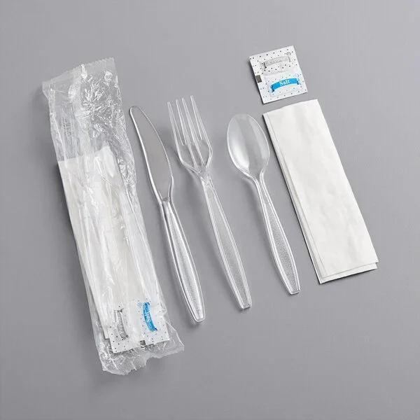 Plastic Cutlery Set Heavy Weight Fork, Knife, Teaspoon, Napkin with Salt & Pepper Clear [500 Pack]